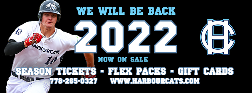 Despite the cancellation of the 2020 and now 2021 seasons due to COVID-19, the Victoria HarbourCats are gearing up for what will be a celebratory season and a return to West Coast League baseball in 2022. Season tickets, 10-game flex packs, gift cards, and merchandise are now on sale through the HarbourCats offices at 101-1814 Vancouver Street, or by calling 778-265-0327. Merchandise, gift cards, and 10-game packs may also be purchased online through “The Cat Shop” at https://victoria-harbourcats-official.myshopify.com/.